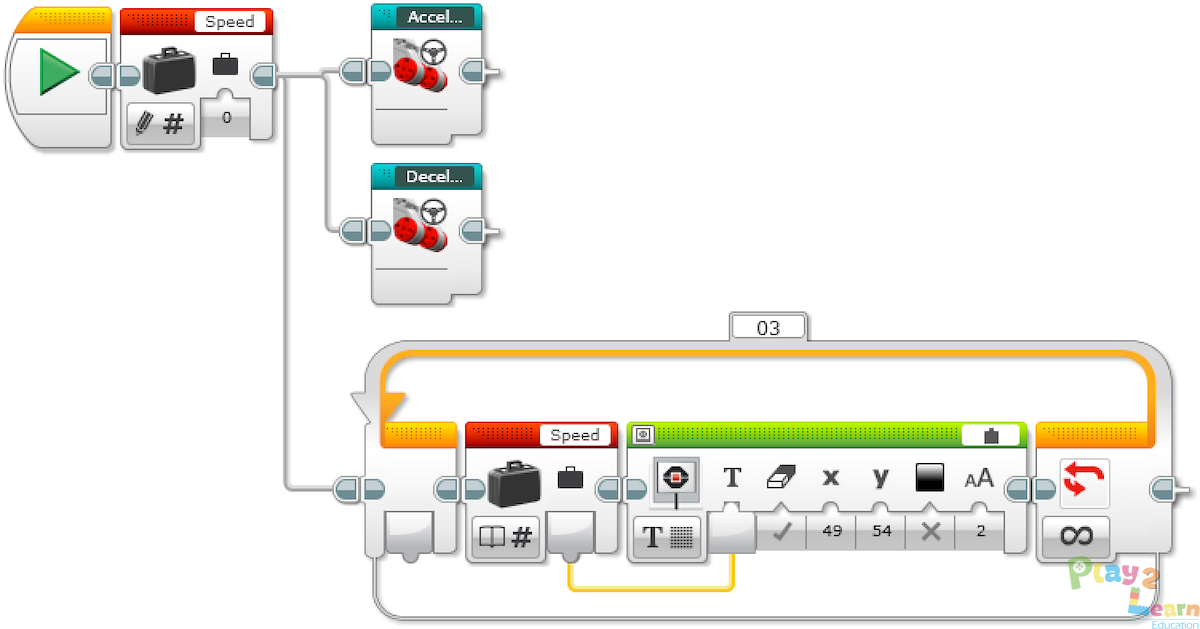 Welcome back Lego EV3 class 6. The objective for this class is to control the vehicle speed by using two buttons, same as real world cruise control in every car. How to change the speed setting value while the motor is running, that is called interrupt. The button click could interrupt the routing anytime, change the speed value up or down by 10%, then the motor execute the new value. We also introduced another useful tool is the user build block. It will help us to organize the main program better and reuse lot of codes. Next class, we are going to review all programs we already learn from previous class, see if you can save them into custom build blocks for future use. And we will prepare for the final challenge.