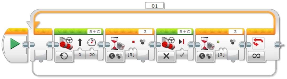 - Start motors B and C at a speed set to the value stored in the variable called “Speed”